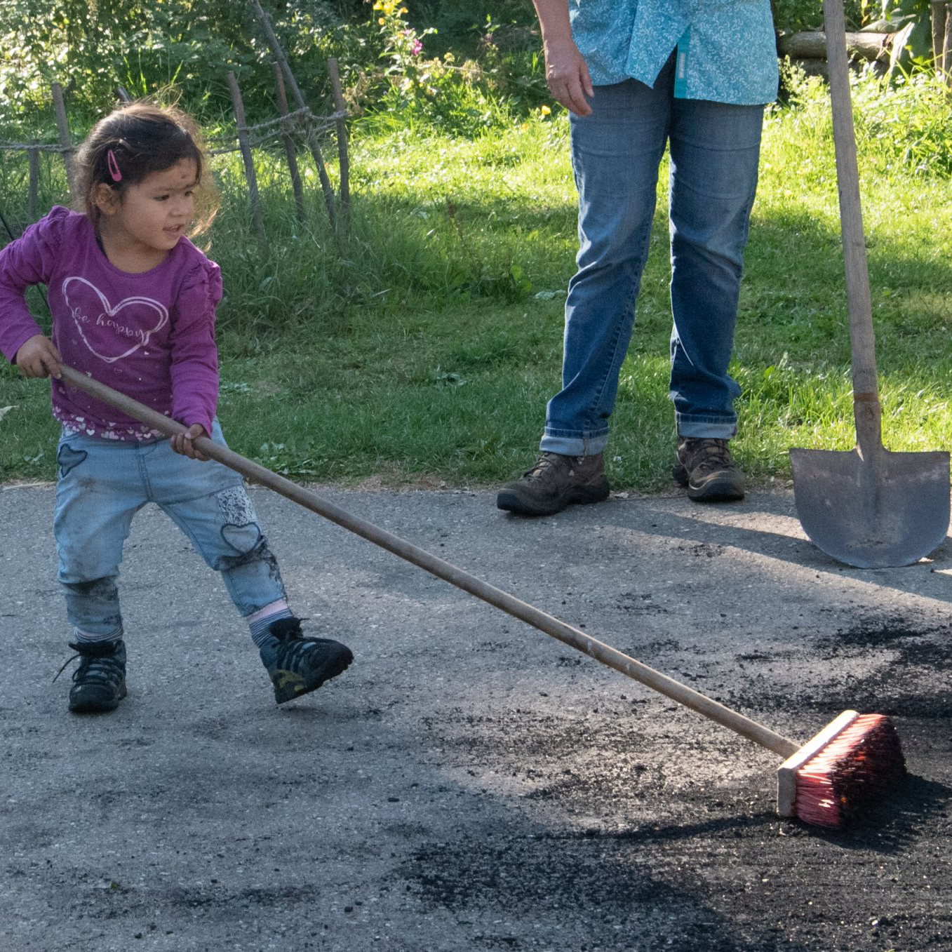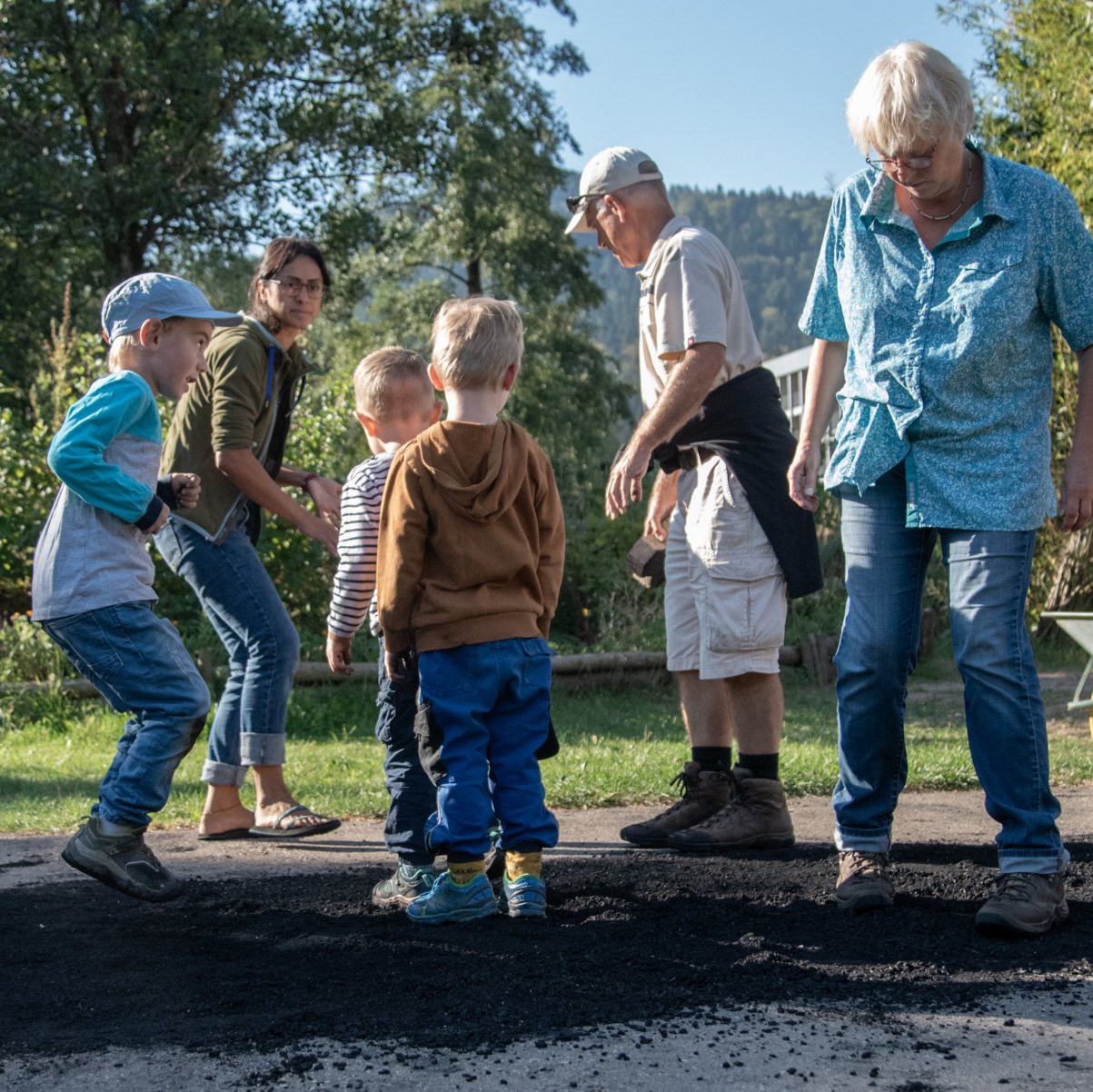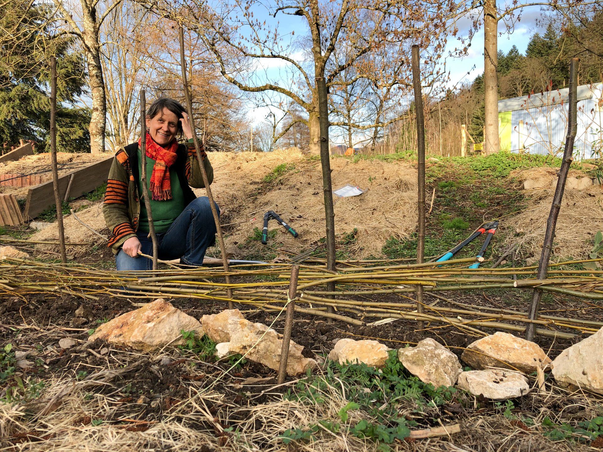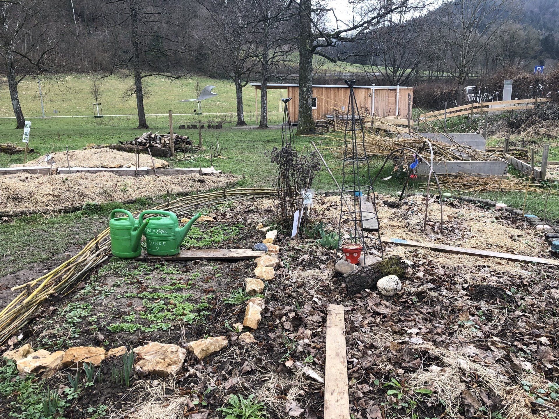 - Kompost direkt auf dem Boden aufschichten (Küchenabfälle, Grünschnitt, Eselsmist, Heu, Schafwolle - dazwischen immer wieder die Startermischung, insgesamt etwa 10 %)