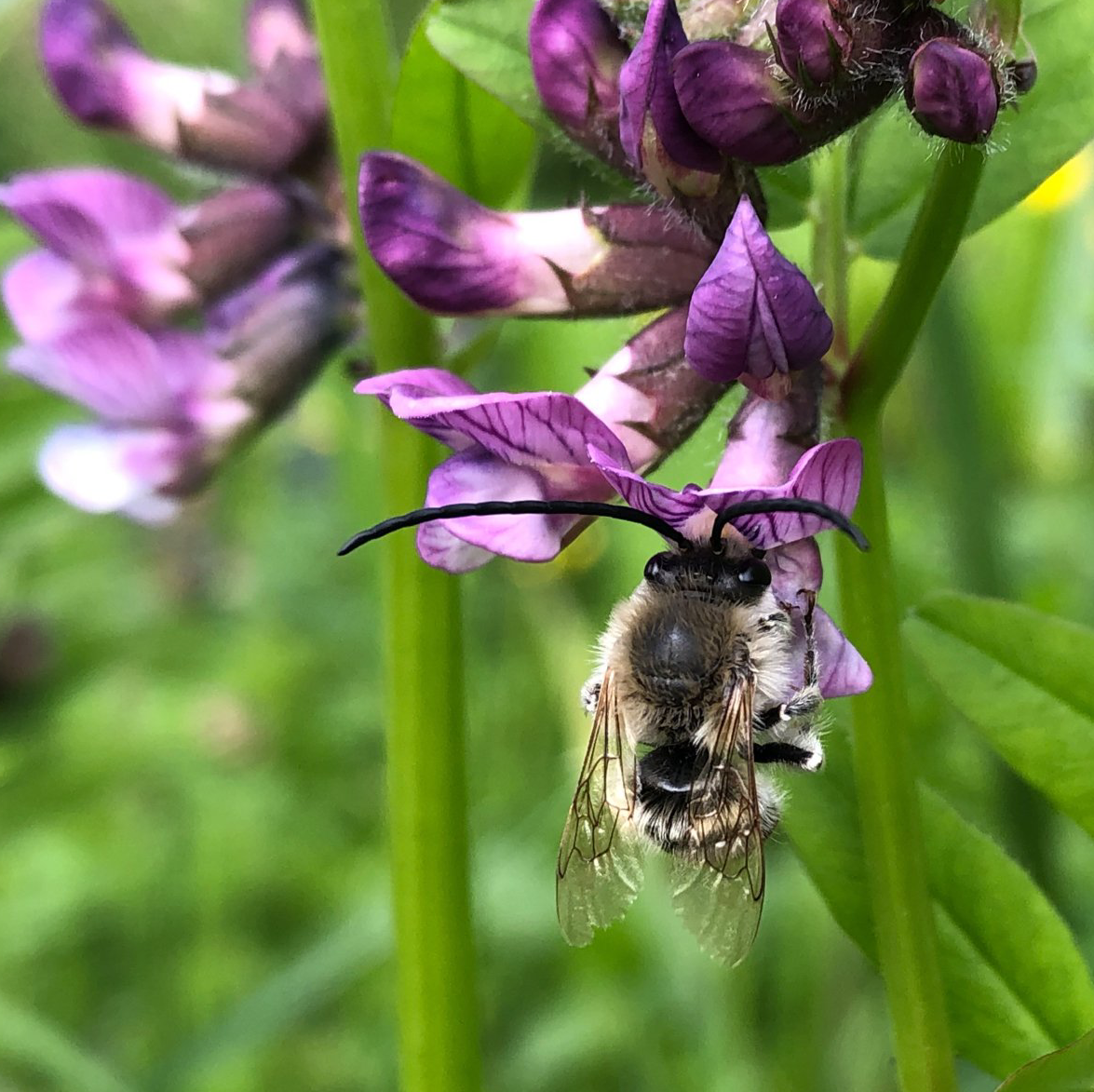 Gerade rechtzeitig zum Internationalen Tag zur Erhaltung der Artenvielfalt am 22. Mai tummelt sich die Wildbiene des Jahres 2021 im Mitmachen-Garten: die Mai-Langhornbiene. Sie besucht ausschließlich Schmetterlingsblütler, da kommen ihr unsere vielen Zaun-Wicken gerade recht (in der intensiven Landwirtschaft findet man sie leider kaum mehr ...)!
