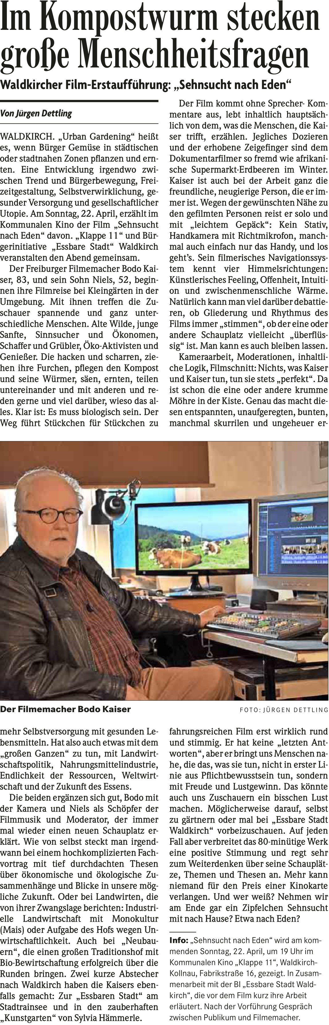 Waldkircher Film-Erstaufführung "Jenseits von Eden"Bodo Kaiser mit seinem Film über die "Urban-Gardening-Bewegung" in Freiburg und Umgebung